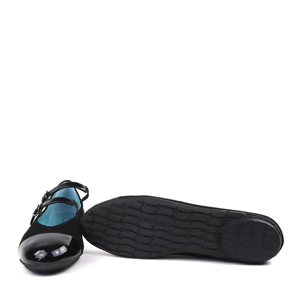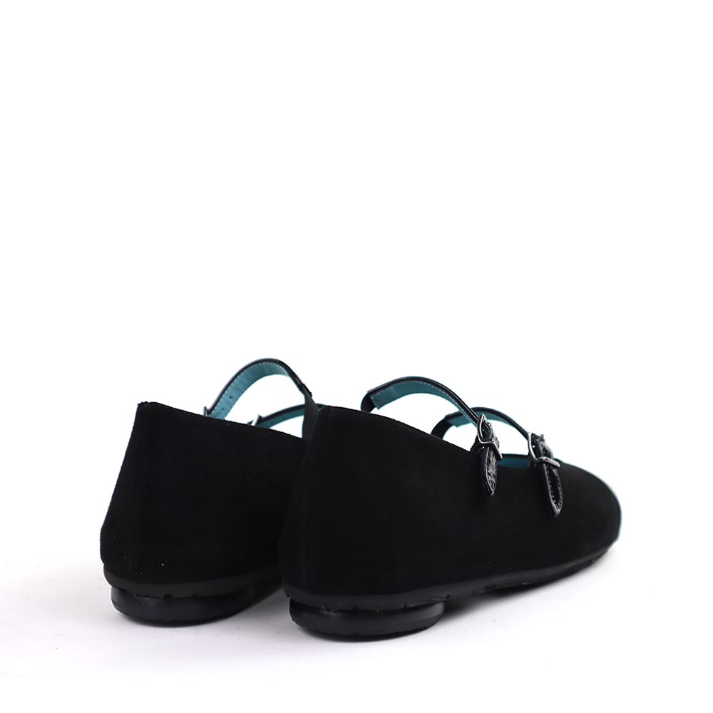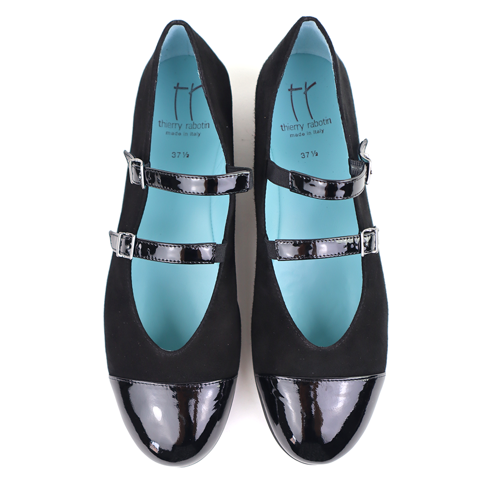 The Gabriella 2462MP flat is a cute mary jane with a double strap. The upper is a black suede with patent cap toe. The sacchetto technique creates a smooth interior and a streamlined fit. The cut comes up over the forefoot preventing irritation on the toe joints. An unbeatable, comfortable flat from Thierry Rabotin.