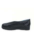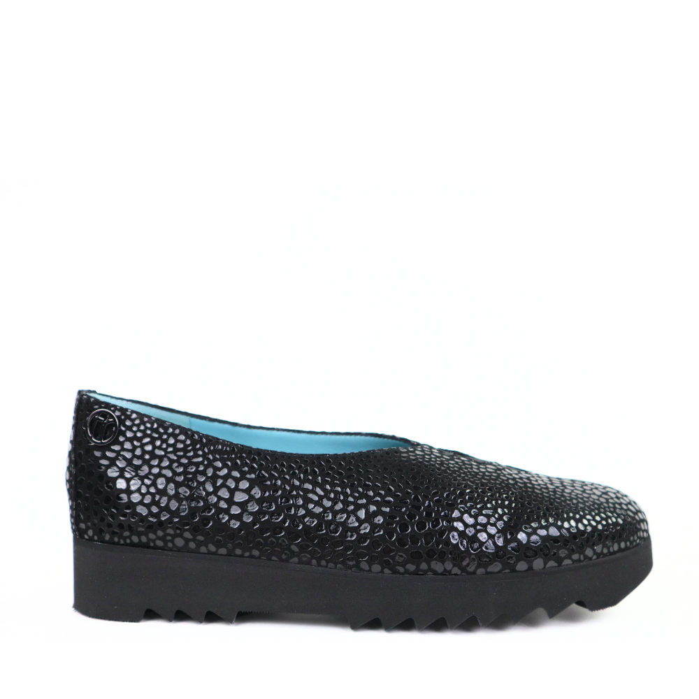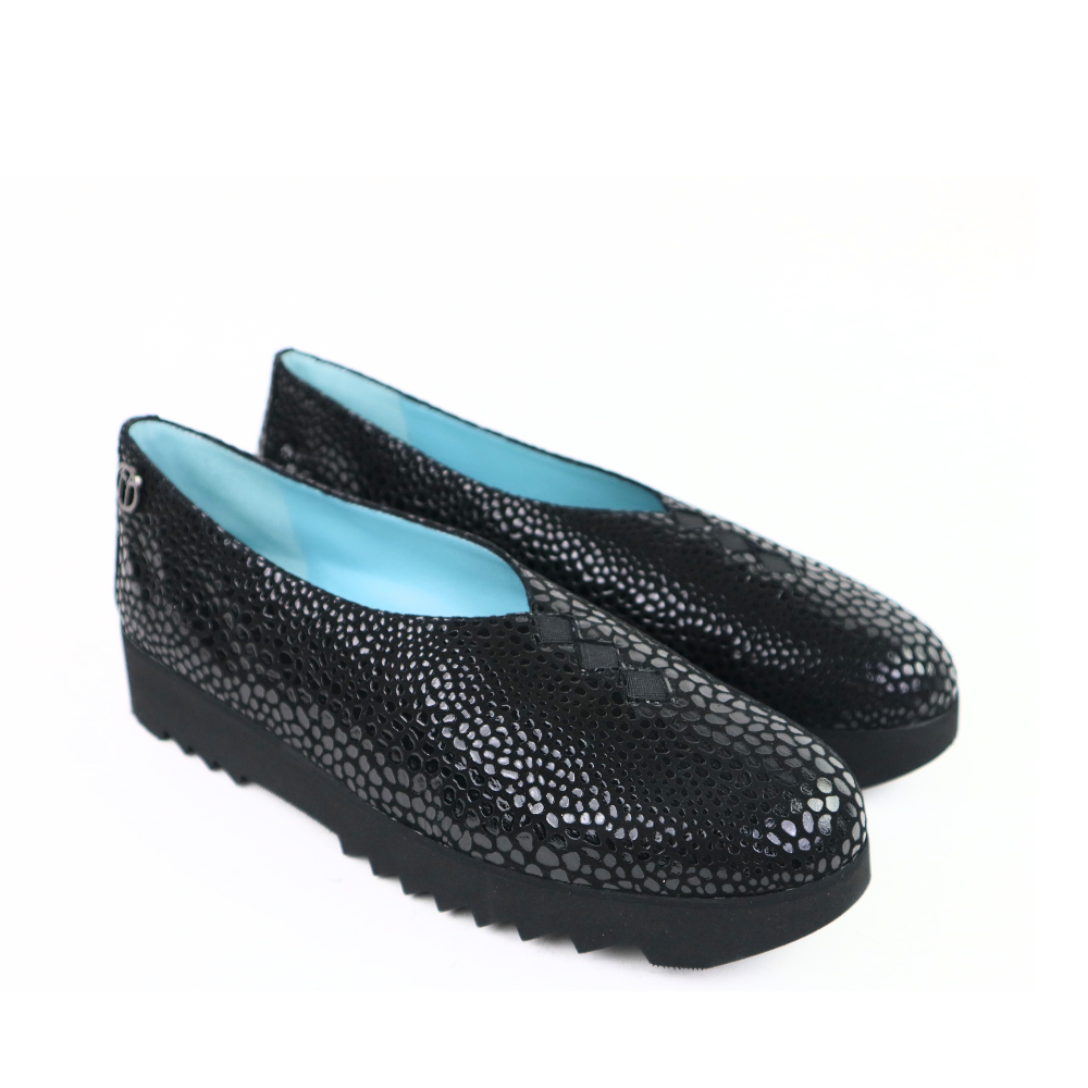 The Grace T0100U platform is a spin on an all-time favorite from Thierry Rabotin. The classic ballet flat sits on a lightweight platform. There are three black triangles that allow the flat to slip on and off easily without losing its shape. The sacchetto technique creates a smooth interior and a streamlined fit. The cut comes up over the forefoot preventing irritation on the toe joints.