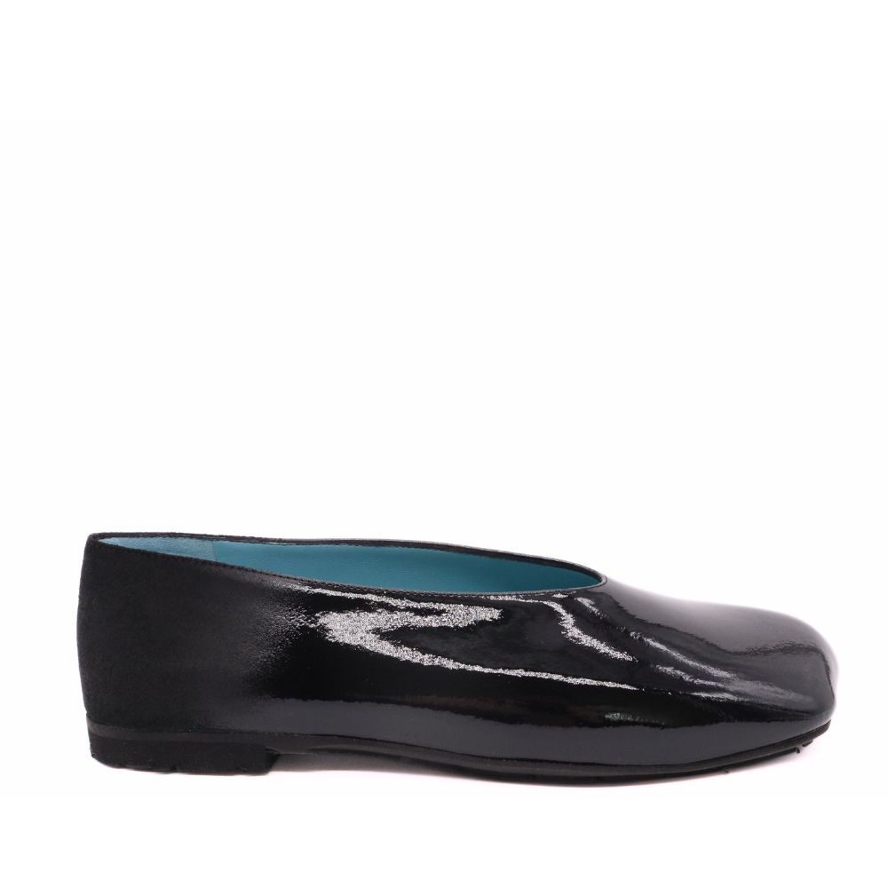 A sleek black patent flat crafted in Italy with Thierry Rabotin's signature sacchetto construction for a soft, glove-like fit. The modern, fashion-forward toe features a natural shape that allows your toes to rest comfortably without feeling confined. The 'degrade' material starts with black patent at the toe and transitions to a less glossy finish at the heel.