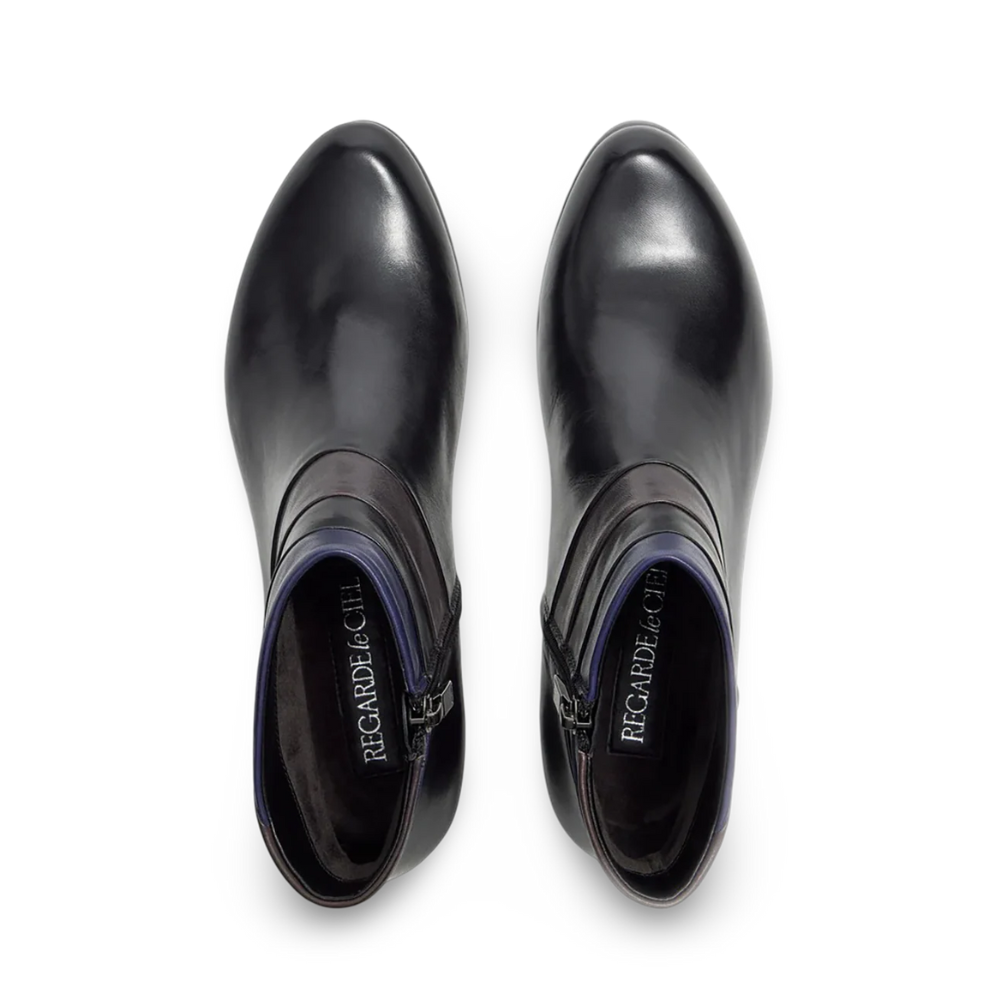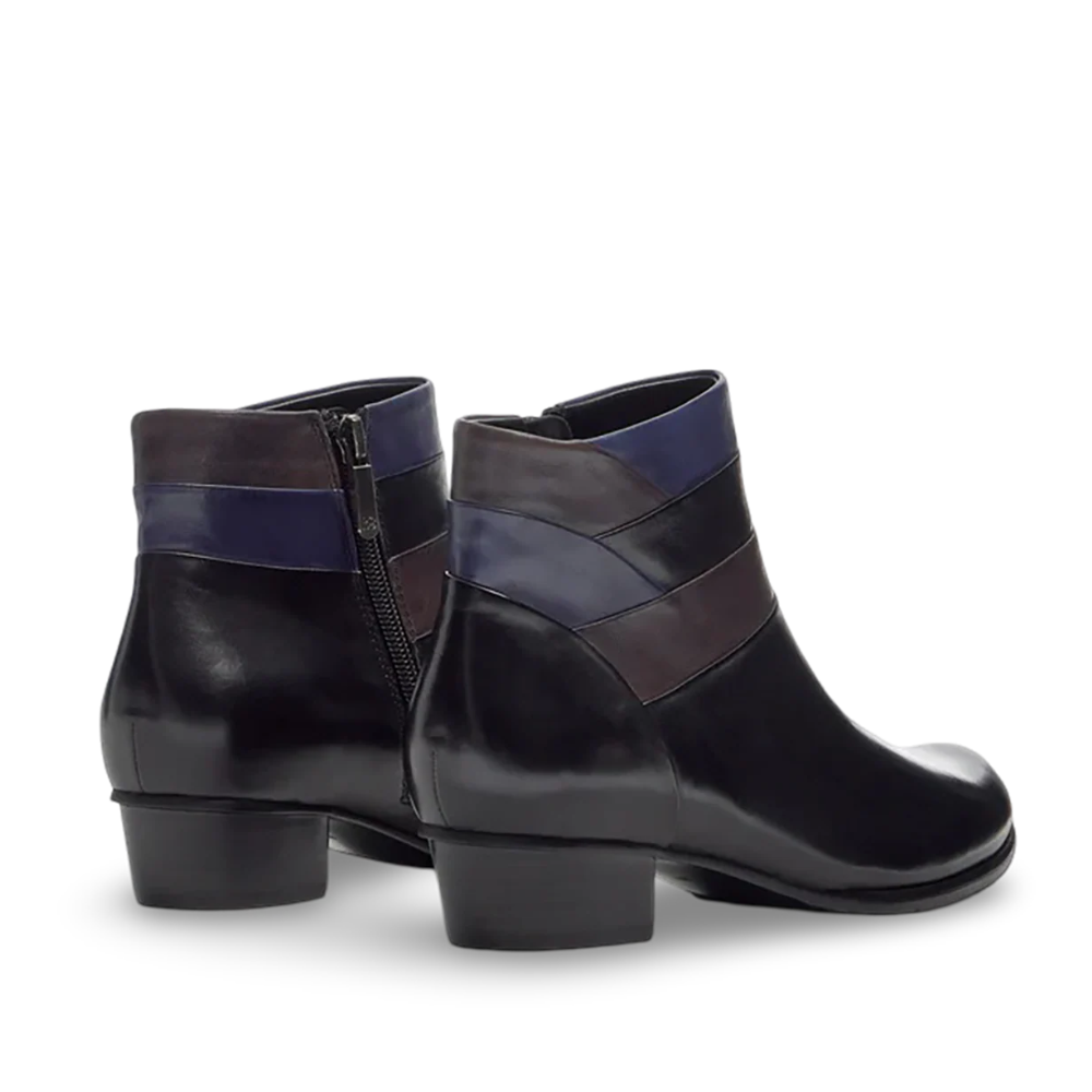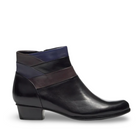 Cute layered short boot, the Stefany-396 features a black, brown, and navy combo leather design. Leather lined insole with cushioning throughout. On top of a 1 1/4" inch stacked heel, and a rubber flexible sole.