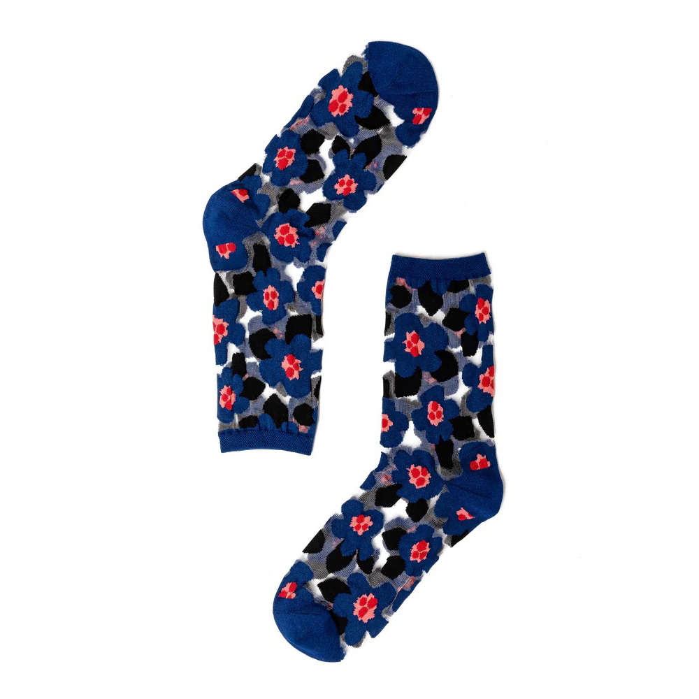 Sock Candy creates playful prints with a sheer fabric base. Geometric style blue florals with unexpected elements of red, pink and black accents give this sock a distinctively edgy vibe.