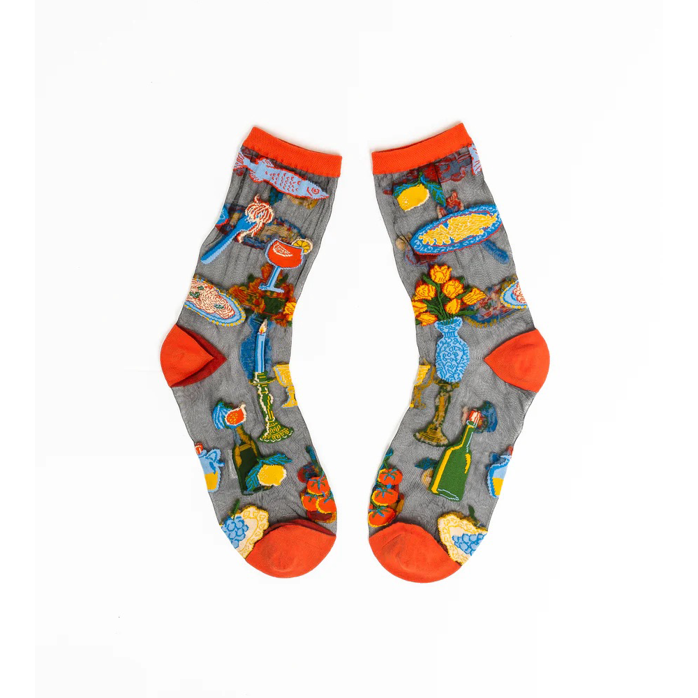 Sock Candy creates playful prints with a sheer fabric base. Transport yourself to Italy in our La Dolce Vita black sheer sock, featuring classic elements of an Italian dinner table, complete with fresh pasta and fish, rustic florals, and vintage wine glasses.