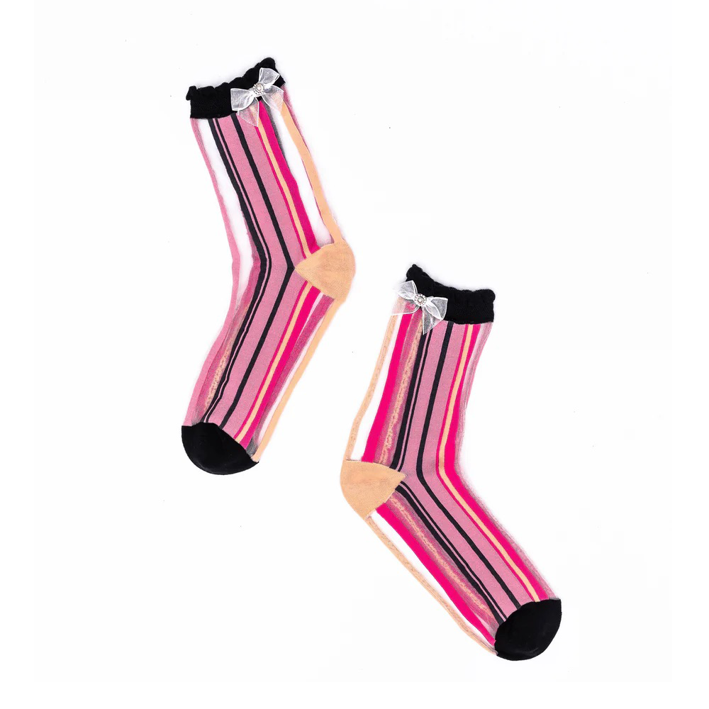 Sock Candy creates playful prints with a sheer fabric base. The Parisian Ruffle Bow features classic pink, black and sheer stripes adorned with a sheer white bow and black ruffle cuff.