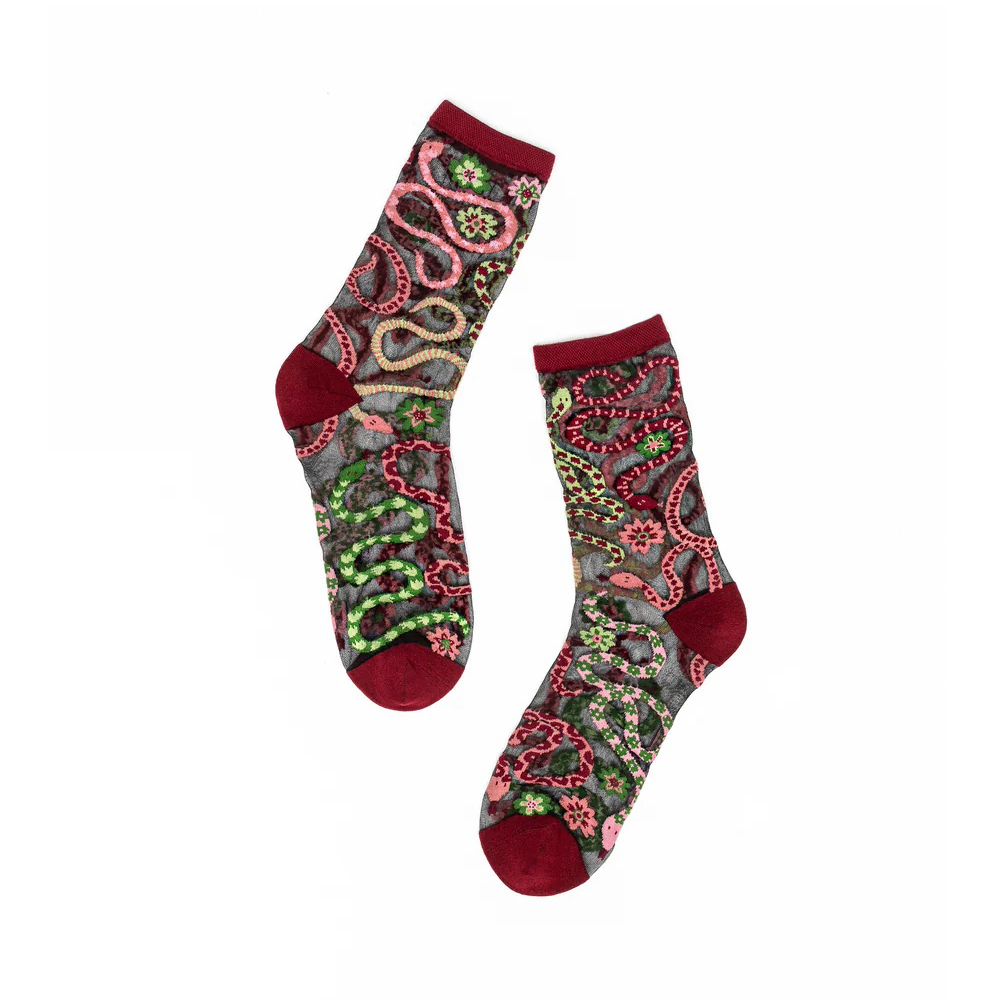 Sock Candy creates playful prints with a sheer fabric base. Dusty pink, burgundy and green snakes slither their way up the feet for a sultry vibe, while vintage florals add a feminine touch.