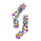 Sock Candy creates playful prints with a sheer fabric base. Four mischievous mermaids are elegantly placed throughout the sock, surrounded by seashells in purple, yellow, and blue.