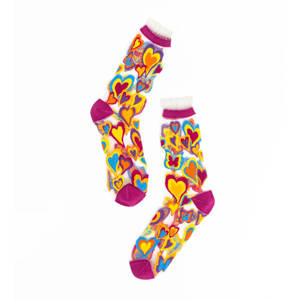Sock Candy creates playful prints with a sheer fabric base. These sheer white Y2K style heart socks featuring multi-colored hearts and butterflies. Finished with a white ruffle cuff.