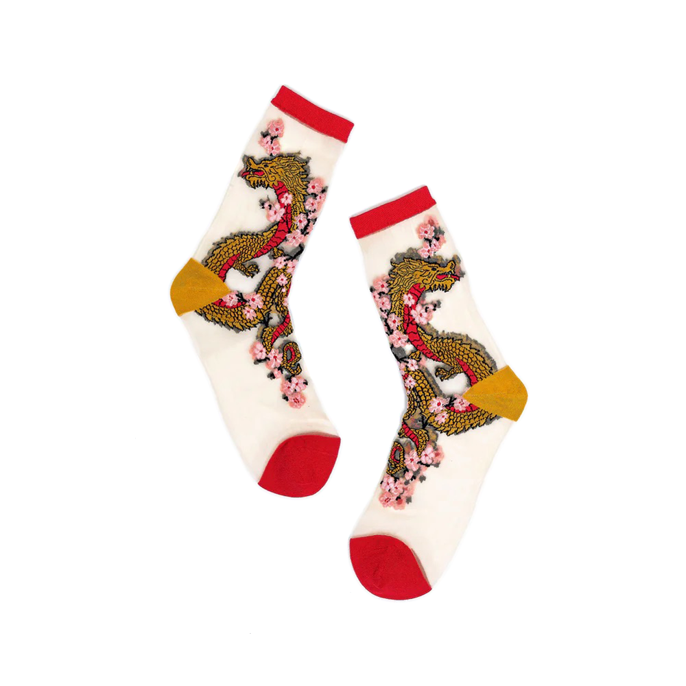 Sock Candy creates playful prints with a sheer fabric base. Two gold and red dragons mirror each other and intertwine, creating perfect symmetry from the front view and a full dragon from the side view.