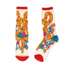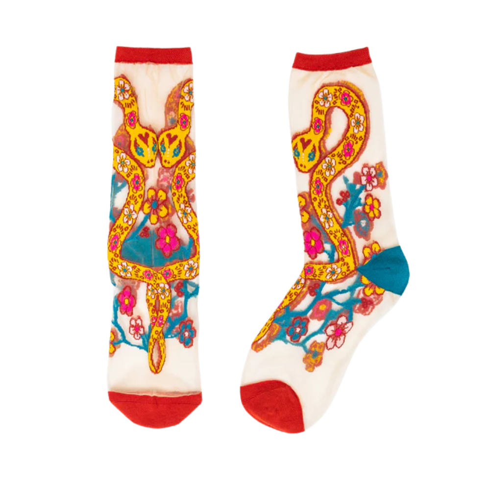 Celebrate Lunar New Year 2025 with our festive Year of the Snake sheer sock. Featuring two yellow snakes with floral patterns in red and turquoise, intertwined to form an abstract heart shape and surrounded by turquoise branches and larger flowers.