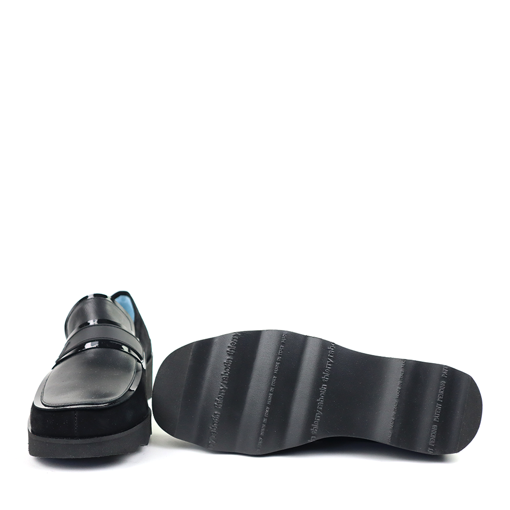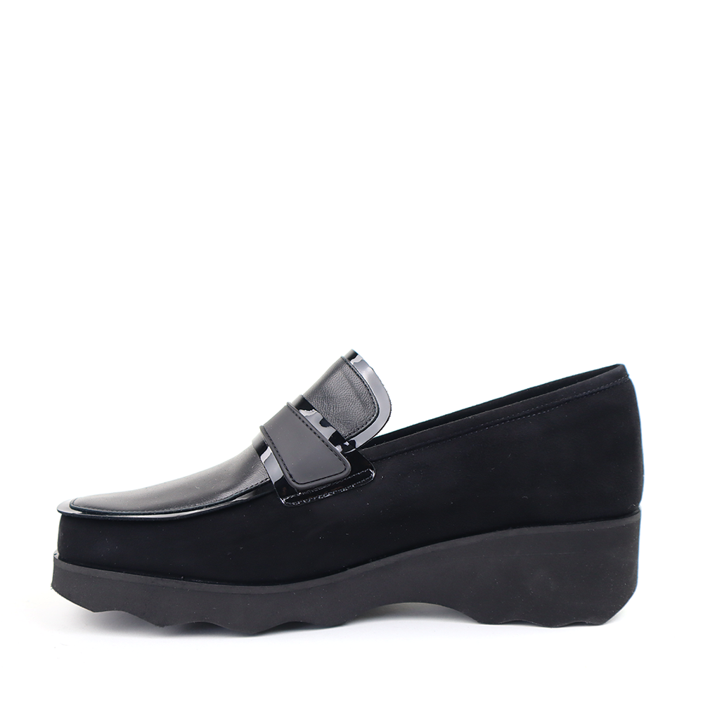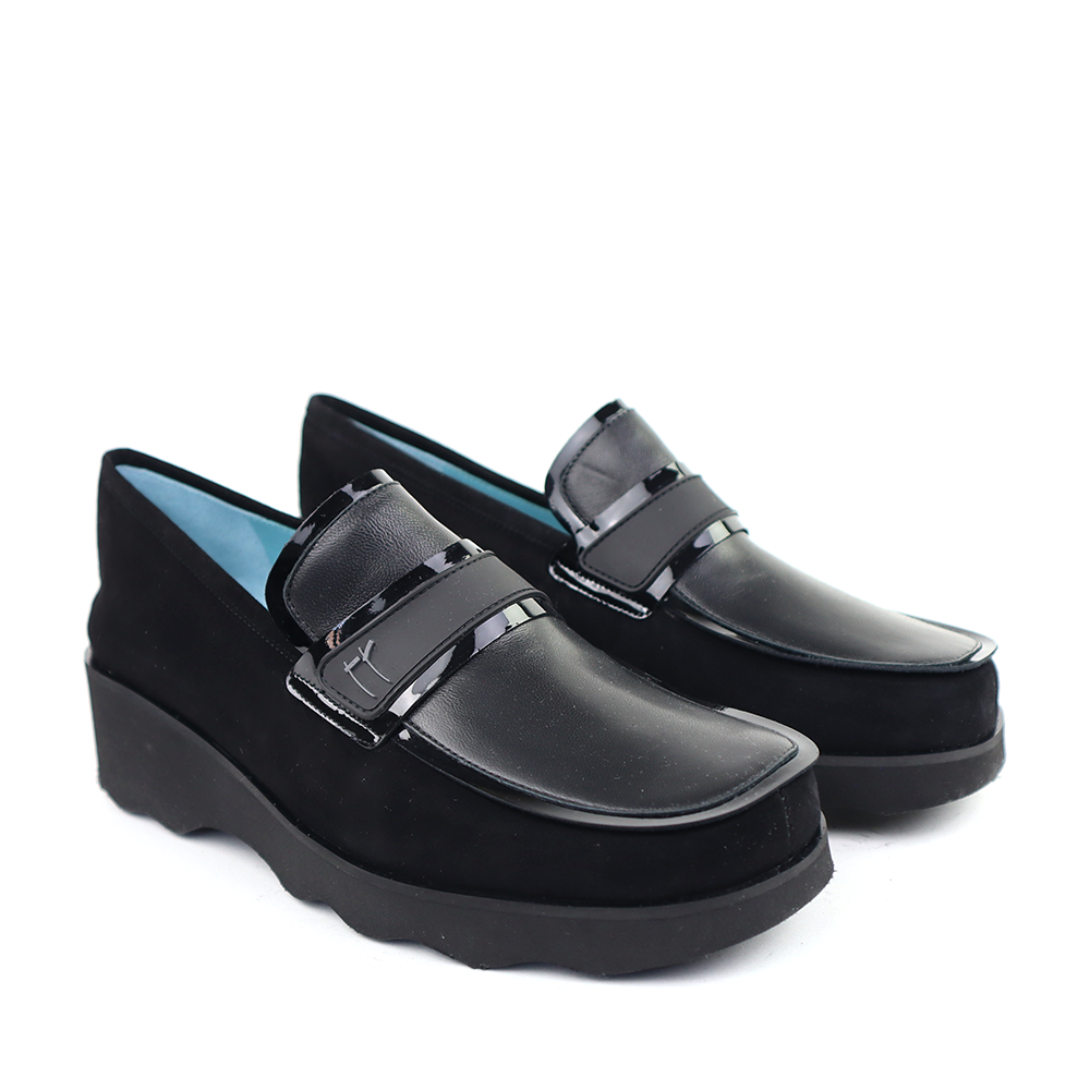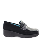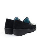 The casual look of the Taz 4131W from Thierry Rabotin makes it perfect for daytime wear. The upper is made of a black suede and nappa that create contrast and dimension. A wedge sole with soft footbed with arch support and Poron memory foam cushioning throughout. Handcrafted in Italy.
